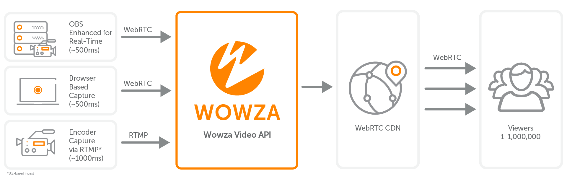 In short, you can enjoy all the benefits of sub-second latency WebRTC but without the limitations of the original out-of-the-box solution. Wowza’s Real-Time Streaming at Scale workflow and expansive CDN make this technology dynamically scalable so not only can you reach a larger audience, but you can also adapt your stream for unexpected audience sizes.