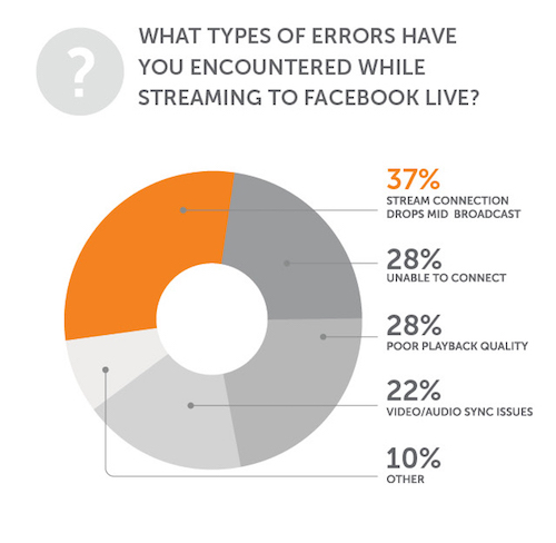 More than three-quarters of respondents report errors when streaming to Facebook Live, with more than one-quarter saying they’re often unable to connect. Even those who can connect have problems such as dropped streams, poor playback quality and/or video and audio sync issues (respondents could select all that applied).