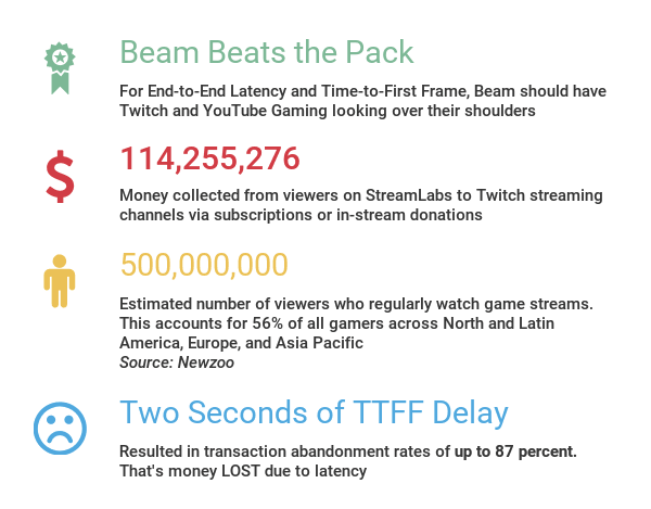 Low latency is crucial for all game streaming platforms, not just Beam. Any time a gamer is holding a live broadcast, real-time streaming is necessary for a high-quality user experience. If latency is high, streamers will lose viewership—causing revenue losses for both the streamers and the platforms themselves.