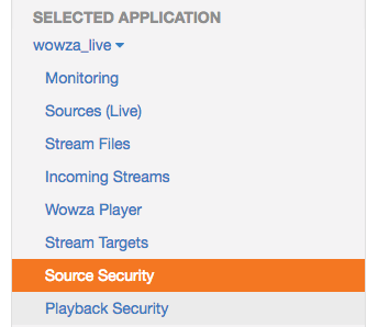 Under the Applications tab, find the live-streaming application wowza_live and select Source Security.