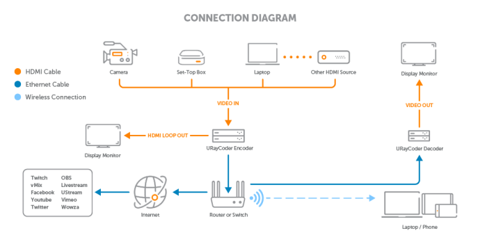 As you see in the diagram, you can also display the video from a separate decoder box, which is convenient for sharing presentations in remote locations. For those seeking slightly different functionality, URayCoder also has other relatively low-cost units that accept SDI input ($249) and output only H.264 ($169).