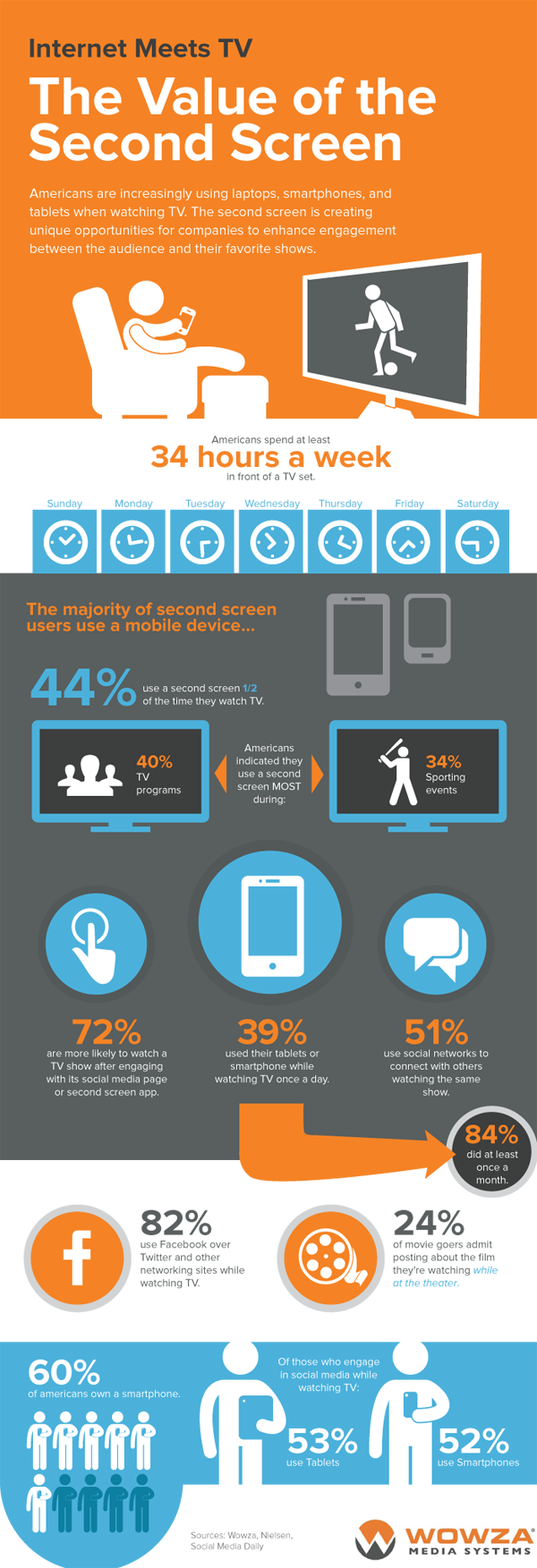 Wowza Media Systems research results of a study that explores the “second screen” behaviors of 500 television viewers. Fifty percent of those surveyed were in the highly desirable 23 to 39 age group that possesses a considerable amount of purchasing power.