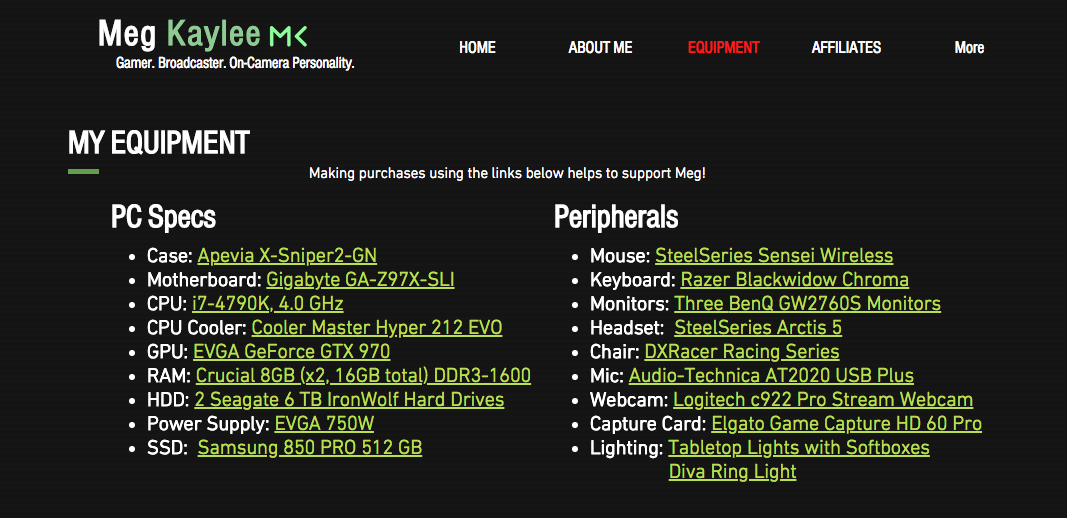 Broadcast Capture With Supplemental Content: Meghan Kaylee is an on-camera host for GameStop TV and is a Twitch broadcaster (@MegKaylee). She uses OBS Studio for broadcast capture, which gives her the ability to show her gameplay as well as other discrete content on her computer, such as web pages or social media content.