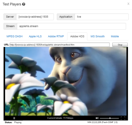 - Paste the playback URL into your player or a mobile browser depending on the protocol. Alternatively, you can use the Wowza Video Test Players webpage. For more information about playback URLs, see About playing Wowza Streaming Engine streams.