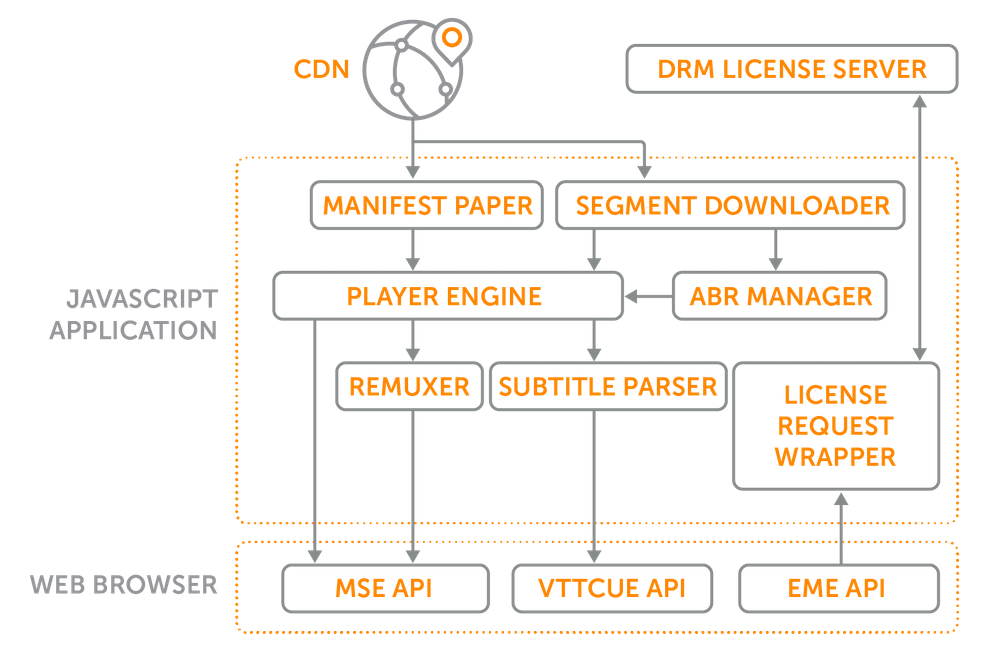 At its core, an HTML5 online video player is a JavaScript package that uses the Media Source Extensions API, or MSE. This API, combined with Encrypted Media Extensions (EME, for features like enhanced security and DRM), and VTTCue (for subtitles) allows developers to use JavaScript to override how browsers handle video tags and improve streaming video delivery.